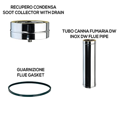 NEL KIT: 1 Terminale cinese, 10 Tubi m.1, 2 Tee, 1 Raccordo caldaia, 1 Piastra di intermedia, 1 Scarico Condensa, 1 Coppia supporti, 1 Collare a muro, 1 Tappo cieco, 15 Fascette, 15 Gurnizioni.