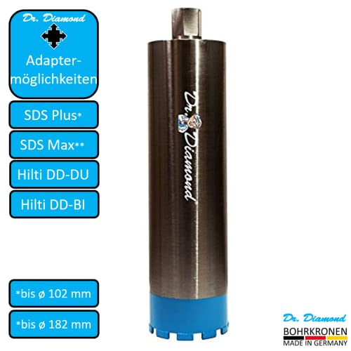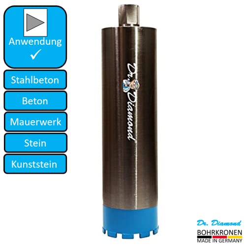 Corona diamantata: la corona di trapano Dr. Diamond con attacco da 1 1/4" e 450 mm di lunghezza utile è realizzata a mano nella manifattura interna ed è quindi Made in Germany.