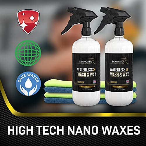Diamond Shine System Waterless Wash & Wax Kit Spray detergente idrofobico per Auto - Carnauba Liquido - Lucidatura Rapida (2 x 1 litro con 4 Panni in Microfibra)