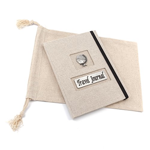 Diario di viaggio, design con mappamondo, in peltro, formato A5 con 120 pagine a righe e tasca interna, completo di intelligente borsa di tela con chiusura a cordoncino