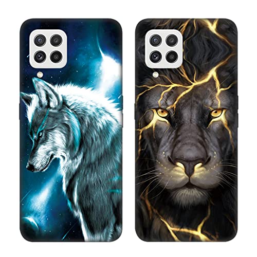 DiaryTown 2 Pezzi Cover per Samsung Galaxy A22 4G, Custodie Silicone Liquido Nero Case con Bello Disegno Antiurto Protettivo Ultra Slim TPU Cover Gomma Custodia per Samsung M32 4G - Lupo & Leone D'Oro