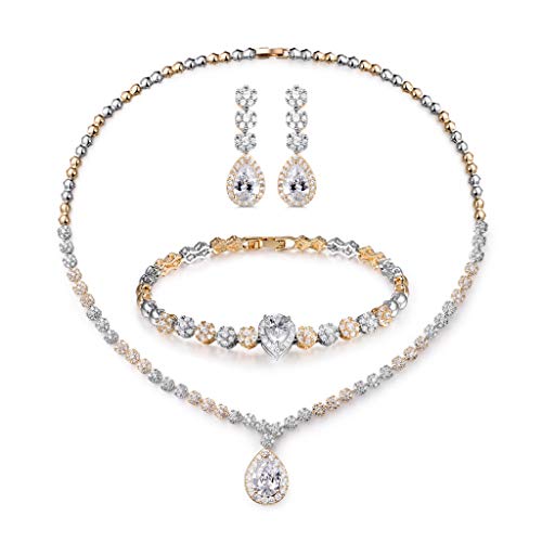 Materiale di alta qualità: Questa parure da matrimonio è realizzata in oro bianco 18 K e placcata in oro giallo 18 K + zirconi bianchi A. Finitura a specchio, senza nichel, ipoallergenica e brillante per sempre. Perfetto per matrimoni, feste. La nostra parure di gioielli da donna è adatta per quasi tutte le orecchie sensibili.