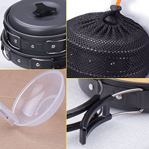 【1】Camping Cook Set - includere 1 pot di campeggio, 1 pot copertura, 1 pan camping, 2 ciotole, 1 cucchiaio da zuppa,1 spatola cucchiaio di legno, 1 pulizia spugna,1 Mesh Bag