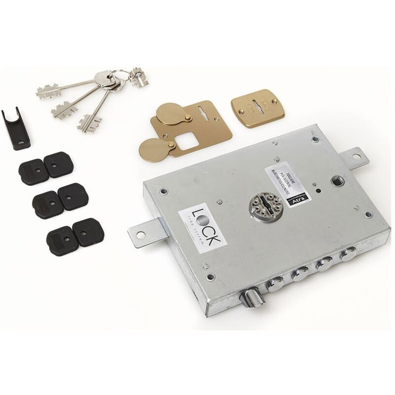 In scatola. Triplice, 4 mandate a scrocco. Scrocco azionabile da chiave o maniglia. Quadro maniglia superiore 8 mm, interasse 85 mm, 4 catenacci, corsa 42 mm. Predisposizione per applicazione aste. Scatola mm 142x206. Realizzata in acciaio zincato. Completa di 3 chiavi ed 1 chiave cantiere. Per porte blindate.. Prezzo inteso per: 1 PZ