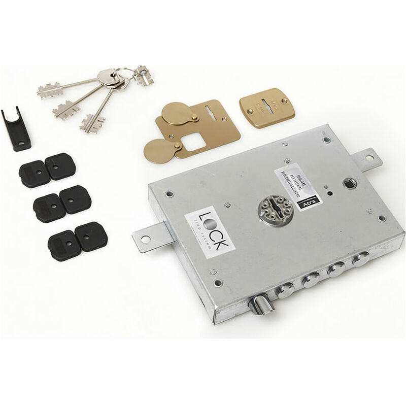In scatola. Triplice, 4 mandate a scrocco. Scrocco azionabile da chiave o maniglia. Quadro maniglia superiore 8 mm, interasse 85 mm, 4 catenacci, corsa 42 mm. Predisposizione per applicazione aste. Scatola mm 152x206. Realizzata in acciaio zincato. Completa di 3 chiavi ed 1 chiave cantiere. Per porte blindate.
