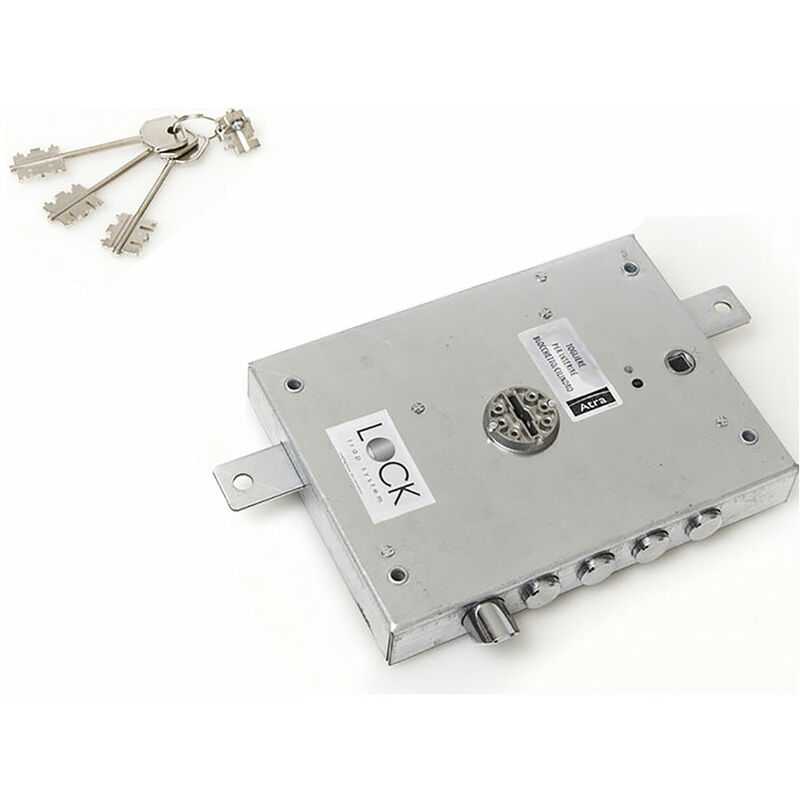 In termopacco. Triplice, 4 mandate a scrocco. Scrocco azionabile da chiave o maniglia. Quadro maniglia superiore 8 mm, interasse 85 mm, 4 catenacci, corsa 42 mm. Predisposizione per applicazione aste. Scatola mm 142x206. Realizzata in acciaio zincato. Completa di 3 chiavi. Per porte blindate.