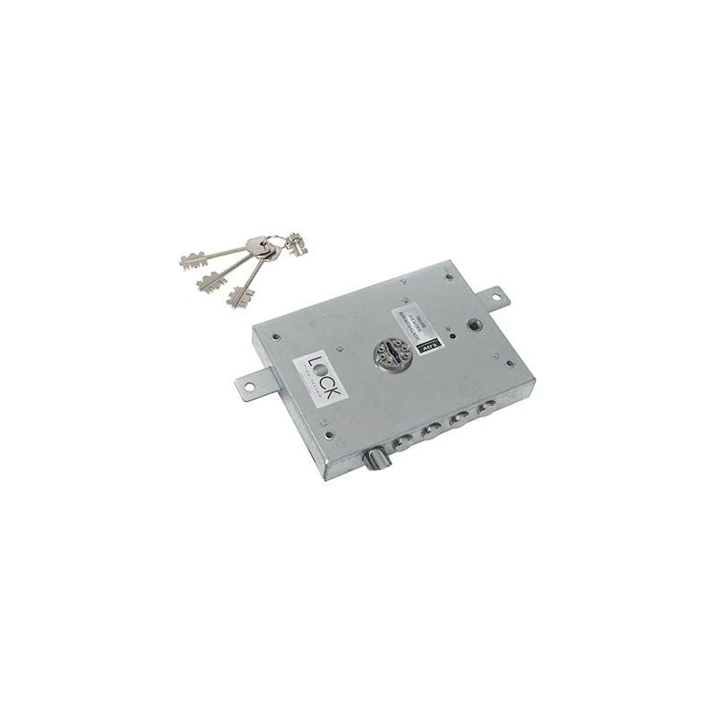 DIERRE ATRA SERRATURA METALLO APPLICARE IMB 61111SE chiave a doppia mappa 3 chiavi incluse A doppia mappa. Scrocco azionabile da chiave o maniglia. Chiusura triplice con catenaccio a 4 pistoni e 4 mandate, corsa Mm. 42, e predisposizione per fissaggio aste, corsa Mm. 18. Quadro maniglia Mm. 8, interasse Mm. 85. Scatola Mm. 142(152)x206. In acciaio zincato. In dotazione: 3 chiavi. In termopacco.