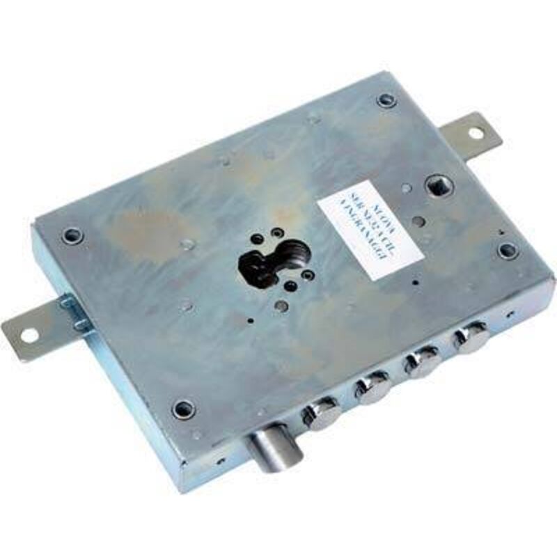 Per cilindro sagomato. Scrocco azionabile da chiave o maniglia. Chiusura triplice con catenaccio a 4 pistoni e 4 mandate, corsa Mm. 40, e predisposizione per fissaggio aste, corsa Mm. 18. Quadro maniglia Mm. 8, interasse Mm. 85. Scatola Mm. 142(150,5)x206. In acciaio zincato. In termopacco.