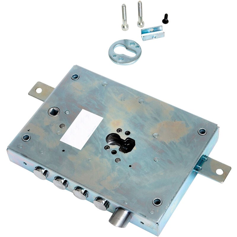 In scatola. Per cilindro a profilo europeo. A 3 mandate, scrocco reversibile azionato da chiave o maniglia. Ingranaggi con sistema antimanipolazione, quadro maniglia 8 mm, interasse 85 mm, 4 catenacci, corsa 40 mm. Predisposizione per applicazione aste. Montaggio cilindro con viti passanti e staffa di bloccaggio. Realizzata in acciaio zincato. Completa di mostrina, staffa di bloccaggio e viti fissaggio. Per porte blindate.