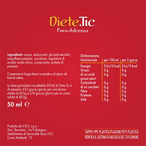 DIETE.TIC - Diete.Tic è un dolcificante liquido con una formula esclusiva brevettata, studiata per dare una risposta al fabbisogno di dolcificare in alternativa allo zucchero ma senza compromessi nel gusto, dunque senza retrogusto estraneo. La sua forma liquida lo rende inoltre molto funzionale all'utilizzo in cucina per ogni preparazione
