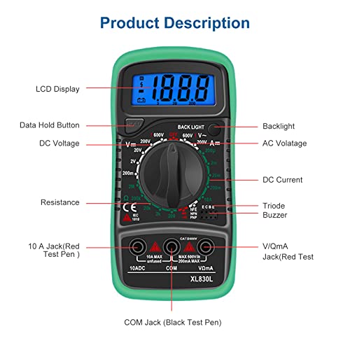 ☑【Multi-Function】: sposta il selettore rotativo per scegliere la funzione desiderata (l'interruttore rotante si trova nell'intervallo di prova corretto) e collega i cavi. Funzione di conservazione dei dati per la registrazione dei dati, la funzione di retroilluminazione aiuta a leggere e testare chiaramente in un luogo buio.