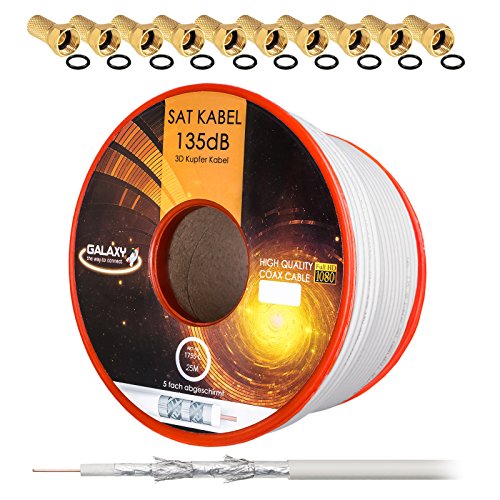 HB Digital 135dB 25m Cavo coassiale SAT in rame puro KU Cavo antenna schermato 5 volte per sistemi DVB-S / S2 DVB-C e DVB-T BK + 10 connettori F placcati oro con anello in gomma Set in omaggio