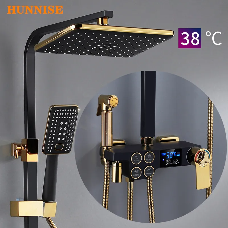 Digital Shower Set Luxury Black Gold Thermostatic Shower System Rainfall Spa Shower Head Brass Bathtub Faucet Digital Shower Set