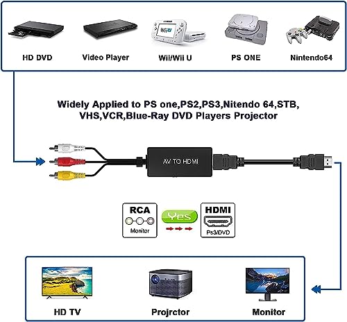 [Ampia compatibilità] - Questo convertitore da ingresso AV a uscita HDMI è ampiamente utilizzato con PS2, N64, Xbox, PS3, lettore DVD, STB e tutti i tipi di dispositivi con uscite AV composite. Supporta i formati TV standard PAL, NTSC3.58, NTSC4.43, SECAM, PAL/M, PAL/N.