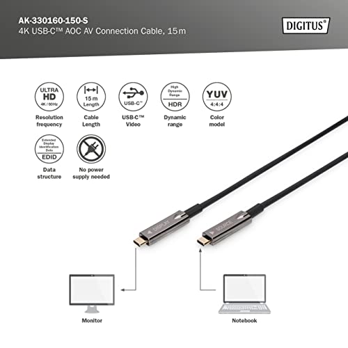 Digitus Cavo di connessione AV da USB Tipo-C a USB Tipo-C AOC Cavo Ibrido in Fibra Ottica 4K@60Hz USB 3.1 Spec 15m