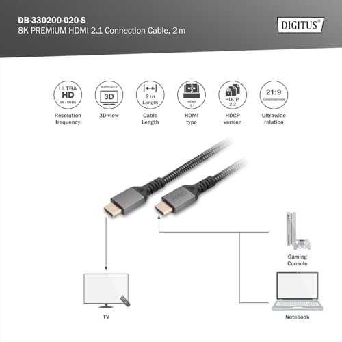 DIGITUS Cavo di connessione HDMI 2.1 Ultra High Speed, UHD-II, 8k/60Hz, 4k/120Hz, cavo intrecciato, 2,0 m, compatibile con PS5, Xbox Series, TV/beamer, contatti placcati oro, nero/argento