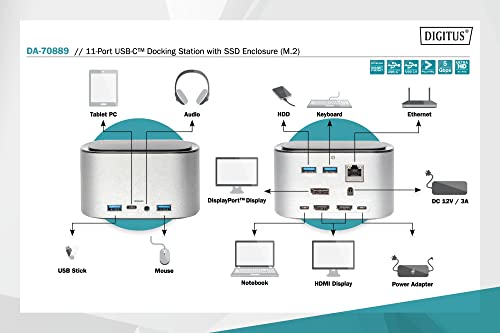 Digitus - Docking Station USB-C a 11 Porte, alloggiamento M.2 SSD, Display Tripple + 2 HDMI - Gigabit LAN - PD 3.0