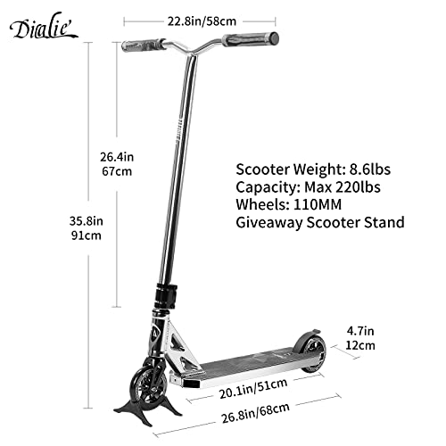 DILALIE Stunt Scooter Stunt Scooter Pro Roller and Trick Scooter Silver for Adulti and Kids Forcella CNC 110 mm Alluminio Core & ABEC-9 Wheel Galvanizzato Deck Monopattino
