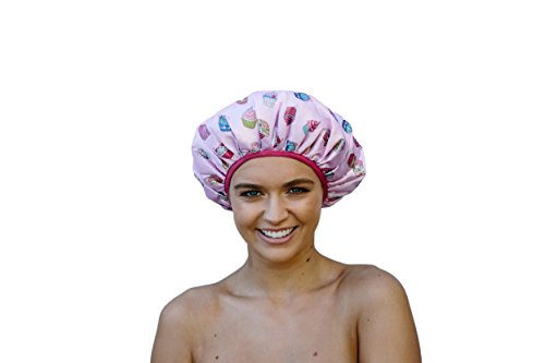 New Dilly's Collections Luxury MICROFIBER Shower Caps Ultra Protective Bath Hat Adult Size Hand Washable - Universal Fit - Reusable - Lightweight - Cupcake Design