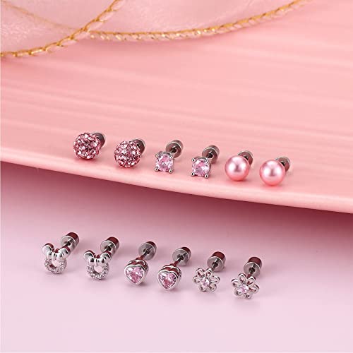 Dimaday 6 Paia Anallergici Orecchini per Donna Ragazze Acciaio Inossidabile 316L Orecchini A Vite Per Ragazze Carini Piccoli Orecchini A Forma Di Cuore Con Fiore Di Perle Cz Set Rosa Tono Argento