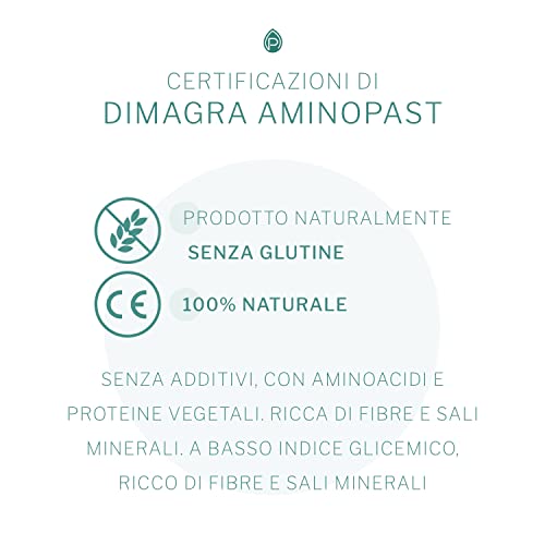 Dimagra AminoPast è il primo prodotto composto da aminoacidi essenziali e da farina di legumi, in proporzione variabile tra ceci, lenticchie, fagioli bianchi e piselli gialli decorticati, cotti a vapore per pochi secondi, essiccati a bassa temperatura e macinati. Gli aminoacidi aggiunti in forma libera sono ottenuti per estrazione da vegetali. Trafilata al bronzo ed essiccata a bassa temperatura.
