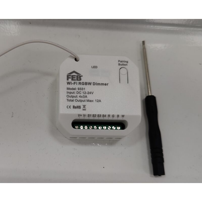 Dimmer smart wifi per strisce led RGB FEB Elettrica 12-24V max 12A - 9331 Dimmer smart wifi per strisce led RGB Specifiche: -Tensione di funzionamento: 12/24 Vdc -Corrente massima: 3A per canale, 12A in totale tra tutti i canali Potenza massima: -12V - 144 W tra tutti i canali -24V - 288 W tra tutti i canali -Rete Wireless: Rete Wi-Fi IEEE 802.11 b/g/n 2.4G & RF 433MHz -Distanza di funzionamento max: 25 m (interno) / 60 m (esterno) -Temperatura di funzionamento: -5 / +50 °C -Dimensioni: 44 x 44 x 22 mm Dotato di: -Led di stato -Antenna -Pulsante di abbinamento -Morsetti di collegamento