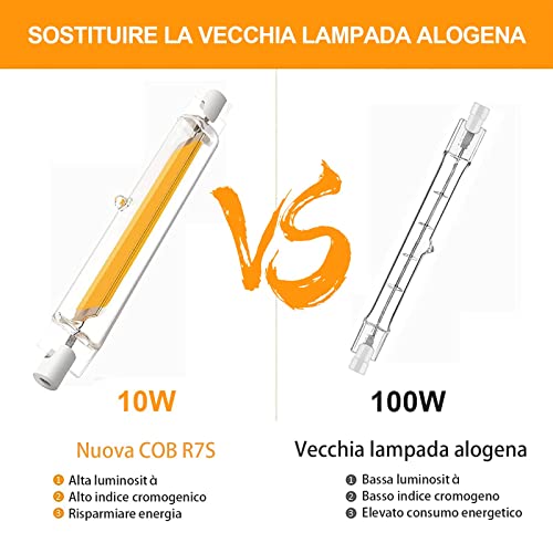 10W R7S LED 78MM: Lampadina LED R7S 78mm dimmerabile, LED COB doppia estremità 1000LM, 3000-6500K Angolo diffusione luce 360 gradi, portalampada ceramica basso contenuto calorico, struttura connessione prova esplosione, chip COB LED alta qualità