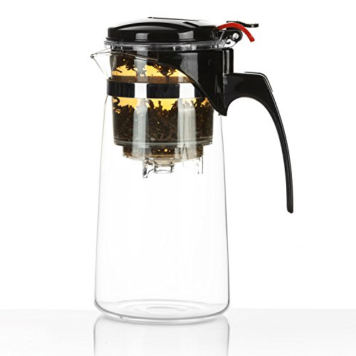 Teiera trasparente - Infusione perfetta di tè in foglie in 4 semplici passaggi: (1) sollevare il coperchio usando il pulsante e inserire il tè in foglie. (2) Versare acqua calda alla corretta temperatura e chiudere il coperchio. (3) Lasciare in infusione il tè a lungo. (4) Premere il pulsante di rilascio e aspettare che il tè scenda nella teiera attraverso il filtro in metallo. Contemporaneamente si arricchisce di ossigeno. (5) Versare il tè nella tazza o nella ciotola da tè. Goditi la bevanda.