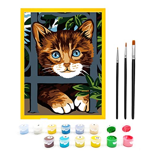 Dipingere con i Numeri Bambini, 9 10 11 anni Gioco Creativo Per Bambine e Bambini con Cornice 3 Pennelli e Colori Acrilici, 18 X 24 cm(Gattino marrone)