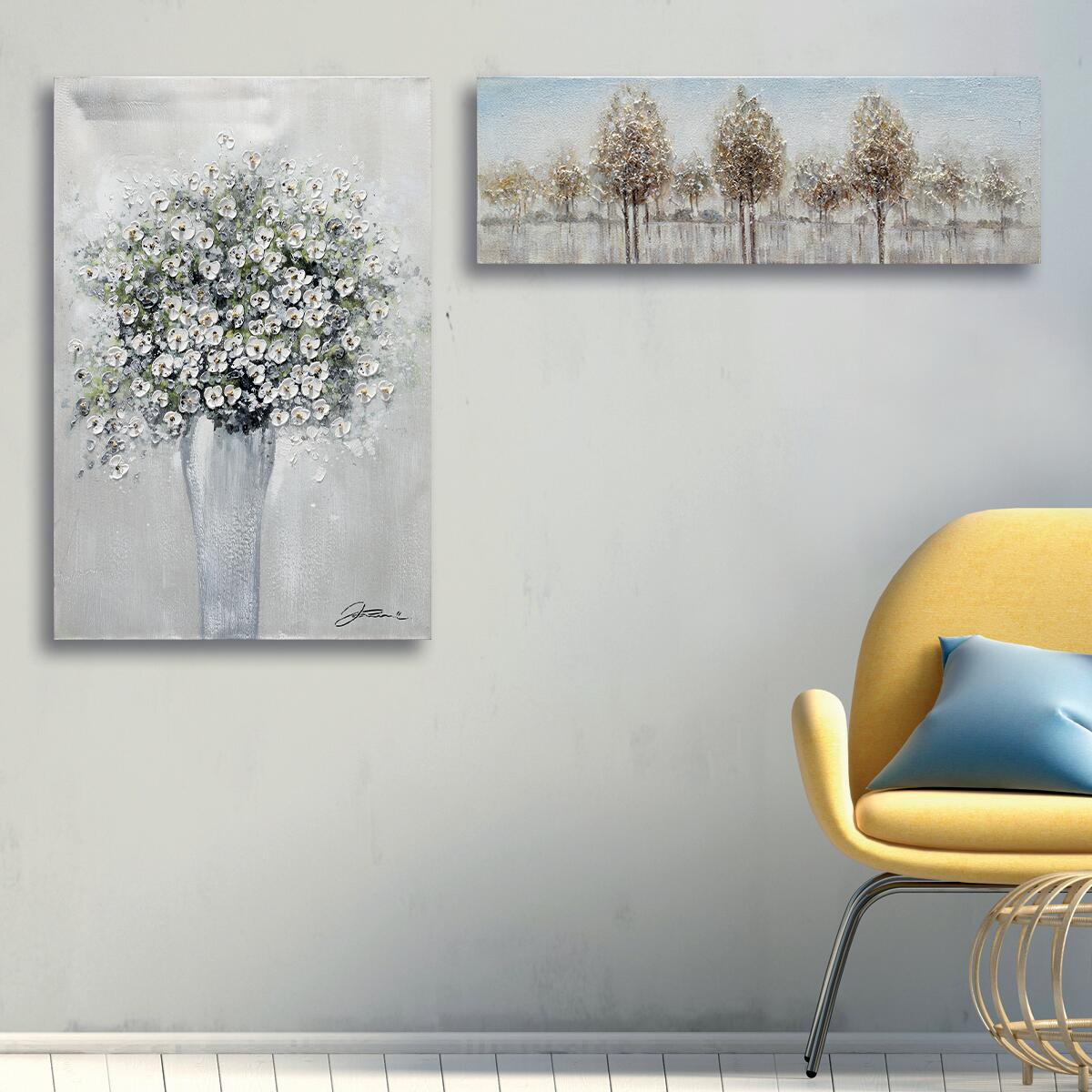 Dipinto a mano con colori acrilici. Tela di cotone su telaio in legno. Misura standard non variabile. Ferramenta per appenderla non inclusa. Facile pulizia. Rimuovere la polvere con un panno antistatico non bagnato. Dipinto a mano