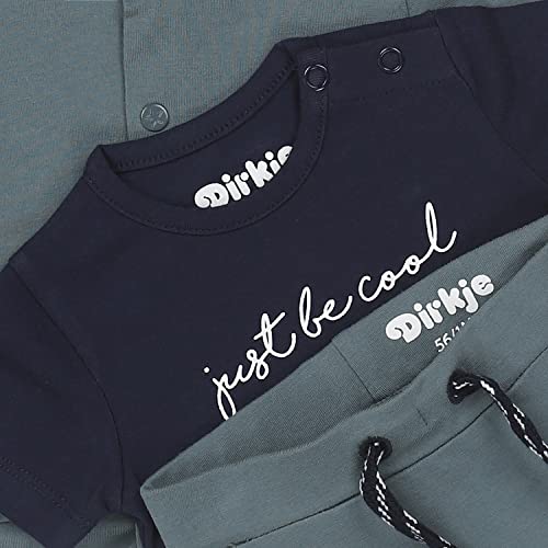 Babysuit: questo costume Dirkje in 3 pezzi in verde polvere con navy è realizzato in cotone organico. Il cardigan ha una striscia che avvolge il braccio e la striscia a strisce simili ai polsini dei pantaloni. La maglietta blu navy è il tocco finale.