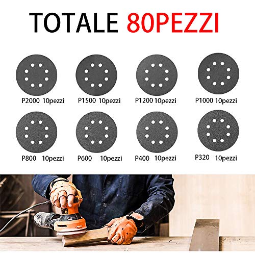⚫【Dischi abrasivi a grana multipla】- Assortimento di carte vetrate a 8 grane diverse da ruvida a fine: 320 # / 400 # / 600 # / 800 # / 1000 # / 1200 # / 1500 # grane, 10 fogli abrasivi di ogni grana, totale 80 pezzi, possono soddisfare le tue esigenze di lucidatura il massimo. 125 mm diametro 8 fori grana mista, ideale per tutte le levigatrici da 5 pollici.