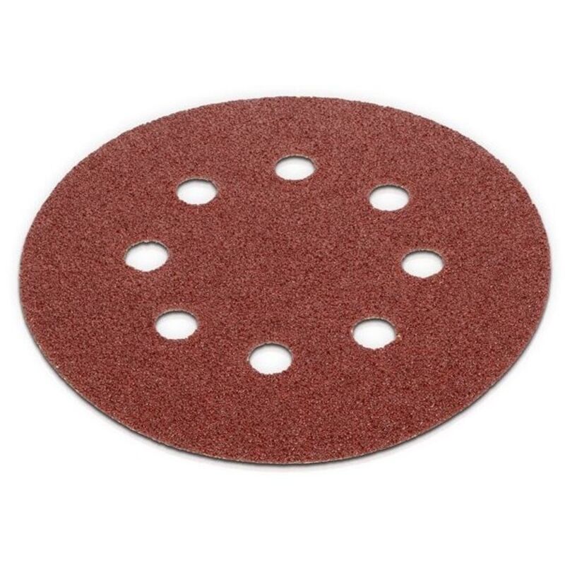 Disco perforato di carta al corindone per levigatura a mano asciutto sulla maggior parte dei materiali. Punzonatura a 8 fori su Ø 65 mm Chiusura: Velcro Dimensioni: Ø 125 mm Grana: 60
