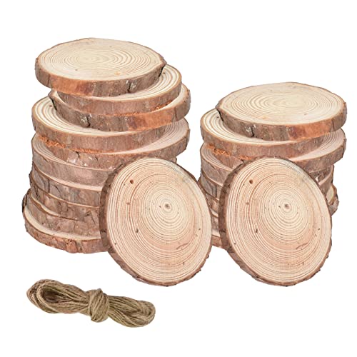 Dischi Legno Naturale, Tronco Legno Naturale, Diametro 8-9 cm Dischetti Legno con Foro, 20 Pezzi Tronchi di Legno con Spago di Iuta per DIY Artigianato Pittura Fai Da Te Decorazione per Feste