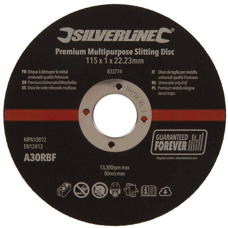Set 10 Dischi da Taglio Smerigliatrice DESCRIZIONE: Disco da taglio piatto in ossido di alluminio rinforzato con fibra di vetro. Adatti a qualsiasi operazione di taglio di metalli ferrosi e non ferrosi, particolarmente con attrezzi da taglio pneumatici. Compatibili con smerigliatrici angolari elettriche e con attrezzi pneumatici da taglio con foro centrale di 22,23 mm. Prodotti in conformità con la EN12413 e approvati da MPA. 115 x 1 x 22,23 mm Prodotto Originale Silverline Cod. 833774