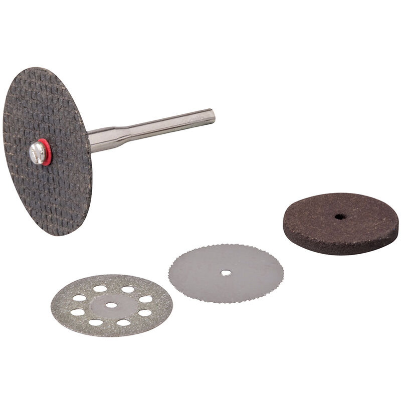 Set 4 dischi lame mole taglio x mini trapano smerigliatrice a stelo dremel Set di dischi da taglio e di smerigliatura per utensili rotanti 5 p.zi il set comprende: 1 disco in ossido di alluminio dm 32 mm 1 lama diamantata dm 22 mm 1 lama dentata dm 22 mm 1 mola abrasiva dm 22 mm 1 alberino con gambo 3,1 mm