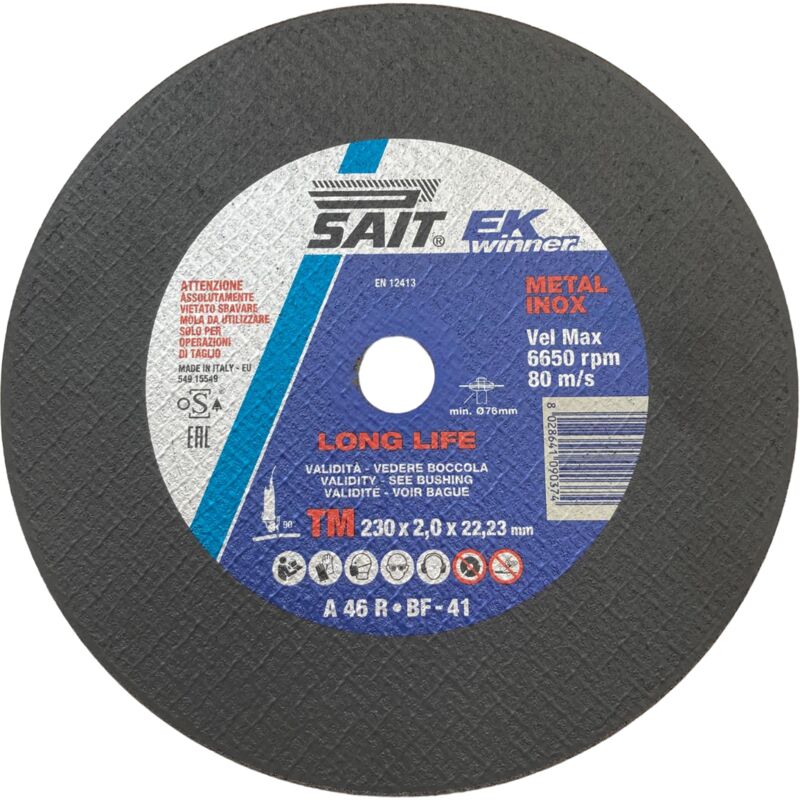 10pz Disco mola abrasiva 230x2.0x22.23 per metalli - SAIT - LONG LIFE EKWINNER Mola ad alte prestazioni e lunga durata Ideale per acciaio,ghisa,inox,metalli ferrosi e non ferrosi PER FLEX SMERIGLIATRICE GRANDE DIAMETRO 230mm Spessore 2mm Foro 22.23 MARCA SAIT -MADE IN ITALY