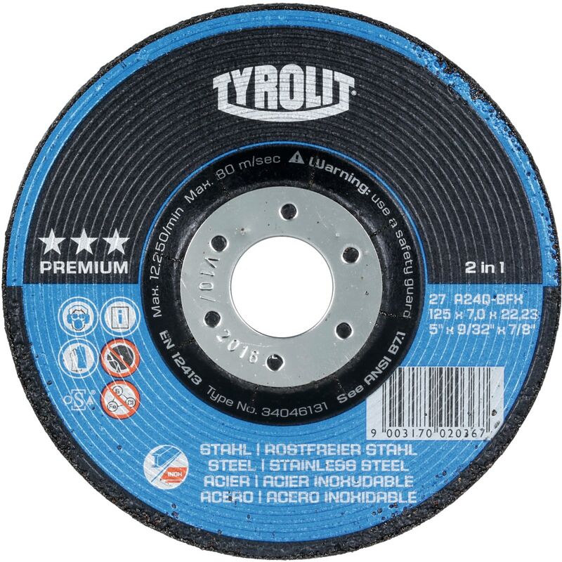 DescrizioneEsecuzione:Grana, legante, additivi abrasivi, nonché rinforzo dei dischi per smerigliatura si adattano in modo ottimale al relativo campo di applicazione per l'elevata capacità di asportazione e durata. Forme: dischi abrasivi per sgrossatura, curvati (forma 27, 28, 29) angolo di rettifica da 20° a 30° Impiego: su smerigliatrici angolari elettriche e pneumatiche con velocità periferica max. di 80 m/s per sgrossatura di punti di saldatura, superfici e bordi.Disco abrasivo per sgrossatura aggressivo (grado di durezza Q ridotto) per impiego universale su INOX e acciaio con elevata capacità di asportazione e durata.Esecuzione aggressiva ad alte prestazioni di durata molto maggiore. I bordi definiti arrotondati permettono un comportamento di rettifica gradevole. In questo modo si evitano incisioni indesiderate. Specifiche tecniche: A24Q-BFX.Dati tecnici Sigla materiale abrasivo A Specifica: A24Q-BFX Percentuale di ferro, zolfo e cloro < 0,1 % Larghezza disco 8 mm ⌀ disco 178 mm ⌀
