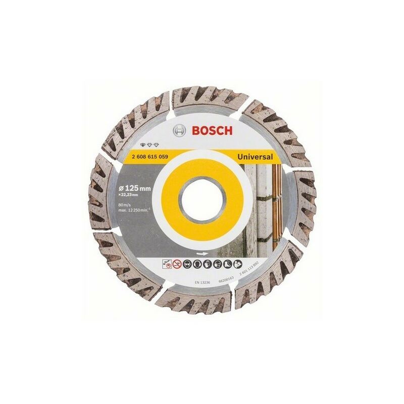 Dettagli: Bosch Standard per dischi da taglio diamantati universali - 2608615059 Caratteristiche: Diametro: 125 mm Alesaggio: 22,23 mm Larghezza di taglio: 2,0 mm Altezza del segmento: 10,0 mm