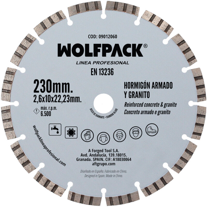 Disco diamantato - Disco diamantato versatile per il taglio di materiali duri come cemento armato o granito. - Dimensioni: Ø 230 mm. - Spessore del disco: 2,6 mm. - Diametro interno del disco: 22,23 mm. - Segmento da 10 mm. con alto apporto di diamante - Speciale disegno della lama per favorire il taglio dei materiali indicati. - Può essere utilizzato sia su materiali bagnati che asciutti.