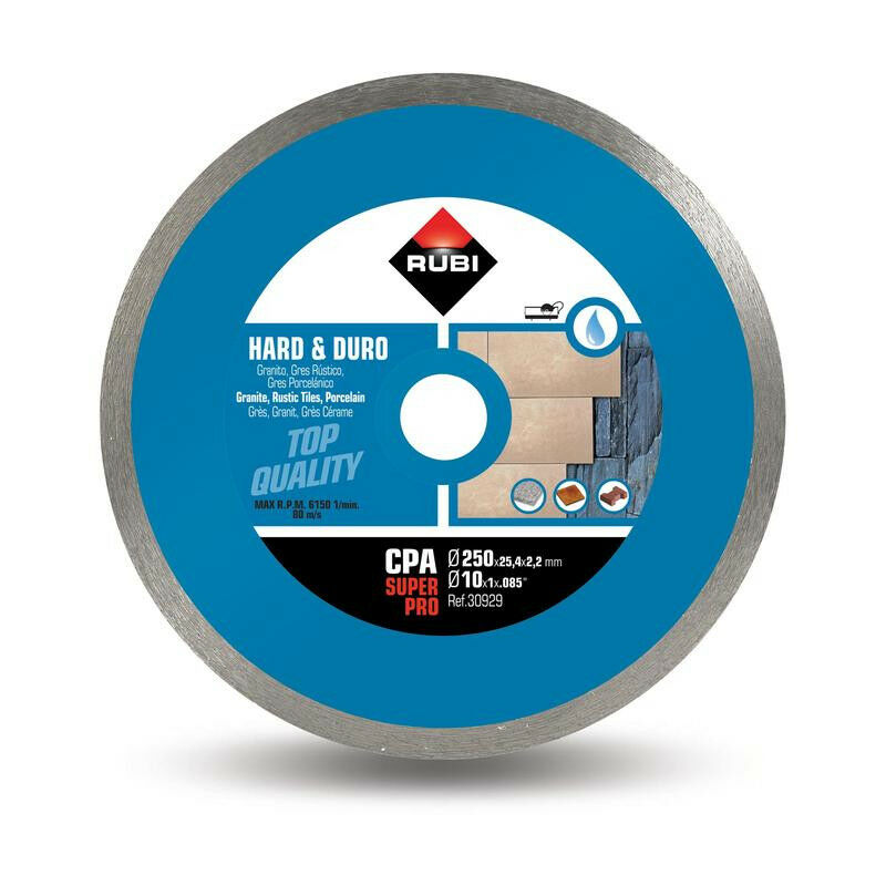 Rubi - Disco diamantato per materiali duri con cerchio continuo 250x25,4x2,2mm - CPA-250 SUPERPRO La gamma di dischi diamantati RUBI CPA è particolarmente indicata per il taglio di materiali duri come: granito, arenaria rustica, clinker, materiali refrattari, ardesia, ecc. Essendo un disco diamantato a cerchio continuo, il disco CPA offre la migliore qualità di finitura. I vantaggi di questo disco diamantato sono: - Consigliato per il taglio di materiali duri come: granito, arenaria rustica, clinker, mattoni refrattari, ardesia. - Il miglior finale. Per tagliare e rifilare piastrelle di ceramica e altri materiali di rivestimento in pietra fino a 25 mm (1 ) di spessore. - Standard EAC russo Dati tecnici: Diametro esterno: 250 mm Foro: 25,4 mm Altezza del segmento del disco: 7 mm Spessore del segmento del disco: 2,2 mm