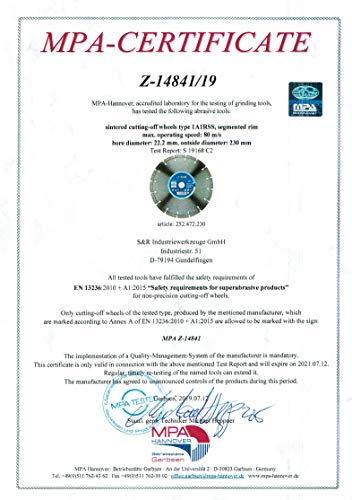 S&R Disco diamantato 230 x 2,2 x 10 mm, saldato al laser. Disco Taglio Cemento, Granito, Pietra, Pietra Naturale, Marmo, Mattoni
