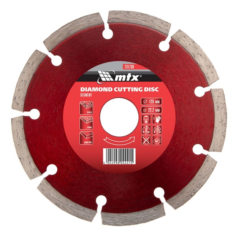 MTX - Disco diamantato segmentato - 125 x 22,2 mm Disco da taglio diamantato segmentato, progettato per il taglio a secco di materiali duri (calcestruzzo, pietra...) Risultati garantiti! Il disco da taglio diamantato MTX è appositamente progettato per il taglio di materiali resistenti come calcestruzzo armato, marmo, ecc. Taglio ottimizzato Le sue sezioni consentono una migliore evacuazione dei detriti di taglio e un miglior raffreddamento della lama per un utilizzo ottimale. Il disco è diamantato, il che gli conferisce un'efficienza superiore. Resistenza ed efficienza Progettato con una politica di efficienza e durata, il disco è realizzato con materiali di qualità: una base in metallo sovrastata da uno strato altamente concentrato di diamanti. Versatilità Questo accessorio da taglio può essere utilizzato con diversi tipi di materiali duri come calcestruzzo, pietra o addirittura marmo! Caratteristiche Generale Colore/i Grigio Prodotto principale Segmentato Raffreddamento migliorato