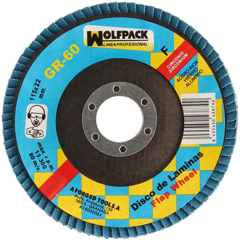 Disco lamellare in zirconio Wolfpack. - Diametro esterno/interno: 115 x 22 mm. - Grana: 60. - Alette del disco con zirconio e un angolo di 10°. Lo zirconio gli conferisce una maggiore durata. - Disco abrasivo per smerigliatrice da 115 mm. - Ideale per pulire i metalli, rimuovere la ruggine dai metalli, rimuovere strati di vernice, lucidare vari materiali, ecc. - È anche noto come disco in acciaio laminato, disco abrasivo in acciaio inossidabile, disco per lucidatura in acciaio.