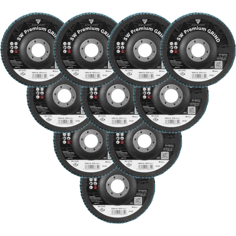 STAHLWERK Premium Grind P80 disco lamellare e mola per disco lamellare ø125 mm set da 10 Disco lamellare STAHLWERK Premium Grind ø125 mm con grana P80. Il disco lamellare conico garantisce prestazioni di levigatura ottimali con una lunga durata e produce un disegno di levigatura pulito. I dischi abrasivi di alta qualità sono forniti in un pratico set da 10 pezzi. Caratteristiche Il disco lamellare ad alte prestazioni offre prestazioni di levigatura ottimali con una maggiore durata e una levigatura pulita. Grazie alla lavorazione di alta qualità, il disco abrasivo è particolarmente resistente all'usura e molto durevole. Grazie alla sua elevata capacità di asportazione, il disco lamellare è ideale per la levigatura di acciaio, ghisa, alluminio e altri metalli e leghe. Prodotto secondo i più alti standard di qualità dal produttore premium Norton. Dati tecnici Modello: STAHLWERK Premium Grind flap e flap disc ø125 mm Tipo di disco: disco lamellare Diametro del disco: 125 mm x 22,23 mm / 5