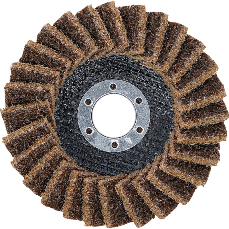 Disco lamellare in vello con vello abrasivo lamellare su piastra in tessuto di vetro per preparare e lucidare le superfici preparazione delle superfici verniciate e per la lucidatura per la levigatura fine di grandi superfici e per la finitura può essere montato direttamente sulla smerigliatrice angolare senza piastra di levigatura aggiuntiva garantisce una finitura superficiale uniforme e di alta qualità robusto e duraturo grana media max. giri/min: 9500 Foro di montaggio 22,23 mm Dimensione dei grani K 80 Peso del tessuto 0.08 Diametro (C) 115 mm Dimensioni dell'imballaggio 1 Peso lordo 80 g Materiale (F) Vlies