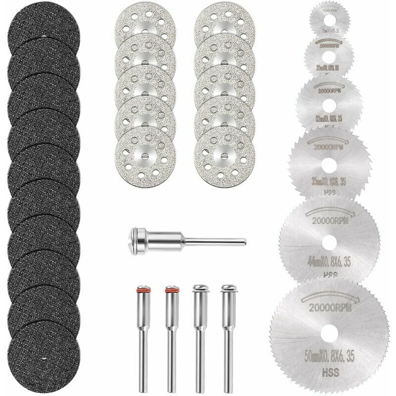 Dettagli del pacchetto: Mini dischi da taglio da 30 pezzi (10 dischi diamantati, 5 lame per sega circolare HSS, 10 mini mole da taglio in resina 5 × mandrini) Personalità unica: i mini dischi da taglio GOXAWEE includono 3 tipi assortiti per più esigenze. Adatto per tagliare, scanalare e rifilare. Idea per progetti fai da te e lavori di scultura. Strumento versatile: il mini disco diamantato viene utilizzato per tagliare la pietra (vetro, marmo, ceramica, piastrelle, roccia, giada). La lama per sega circolare Mini hss viene utilizzata per tagliare la plastica legno, modifica dell'alloggiamento, circuiti stampati. Il mini disco da taglio in resina viene utilizzato per tagliare metalli teneri (acciaio, ferro, alluminio). Compatibilità: il gambo dei mini dischi da taglio da 3 mm è compatibile con la maggior parte degli utensili rotanti e mini smerigliatrici elettriche/mini trapani. Strumento eccellente per gli appassionati del fai da te: elevata efficienza lavorativa, effetto di taglio