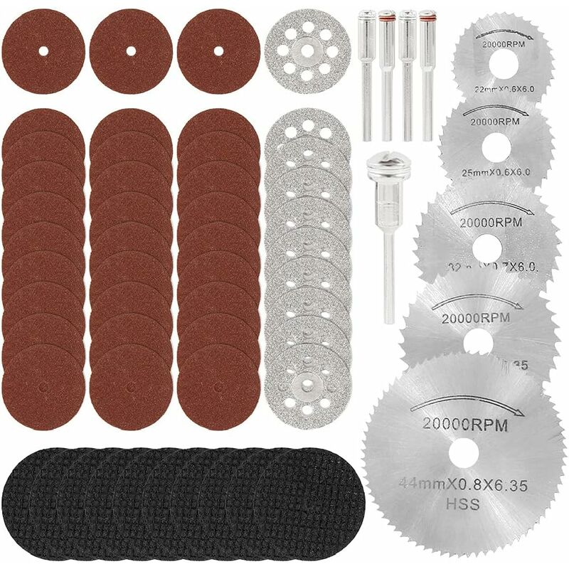 DETTAGLI PACCHETTO - : Mini dischi da taglio da 60 pezzi, tra cui 5 lame circolari HSS, 10 dischi da taglio smeriglio, 10 dischi da taglio in resina nera, 30 dischi per lucidatura rossi e 5 mandrini [STRUMENTO VERSATILE]: Le lame circolari hanno un elevato grado di resistenza alla fatica, possono tagliare legno, plastica, pietre, vetro e metalli teneri [AMPIO UTILIZZO]: Il kit di ruote da taglio rotanti include 5 dischi da taglio assortiti per esigenze diverse. Adatto per taglio, scanalatura e rifilatura. Buona scelta per progetti fai-da-te e lavori di scultura [BUONA COMPATIBILITÀ]: Il gambo da 3 mm/3,3 mm dei mini dischi da taglio è compatibile con la maggior parte delle smerigliatrici elettriche o degli utensili rotanti [OTTIMO STRUMENTO PER GLI AMANTI DEL FAI DA TE]: Lavoro più efficiente, effetto di taglio perfetto. Sostituisci essenzialmente la mini sega con manico Mini disco da taglio diamantato da 60 pezzi, mini lama per sega circolare HSS, mini disco da taglio in resina