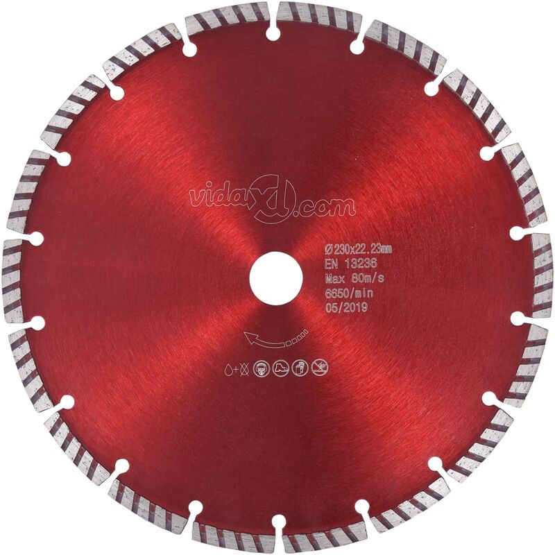 Caratterizzato da un tagliente sottile, questo disco diamantato, se montato su seghe da banco, troncatrici e smerigliatrici, è adatto per il taglio di calcestruzzo, granito, mattoni e altre applicazioni industriali e per la lavorazione manuale della porcellana o del grès. I distintivi segmenti turbo conferiscono alla lama diamantata velocità di taglio più elevate mantenendo un taglio regolare. L'acciaio premium e il materiale diamantato portano a una perdita di materiale ridotta e quindi a una durata ottimale. Inoltre, il disco diamantato è prodotto da una pressa a freddo ed è adatto sia per il taglio a secco che a umido. Colore: Rosso Materiale: Acciaio, lega con diamante Diametro: 230 mm Diametro del foro centrale: 22,23 mm Lunghezza del bordo: 7 mm Velocità massima: 80 m/s Velocità operativa massima: 6650 giri / min Con segmenti turbo Adatto sia per taglio a secco che a umido
