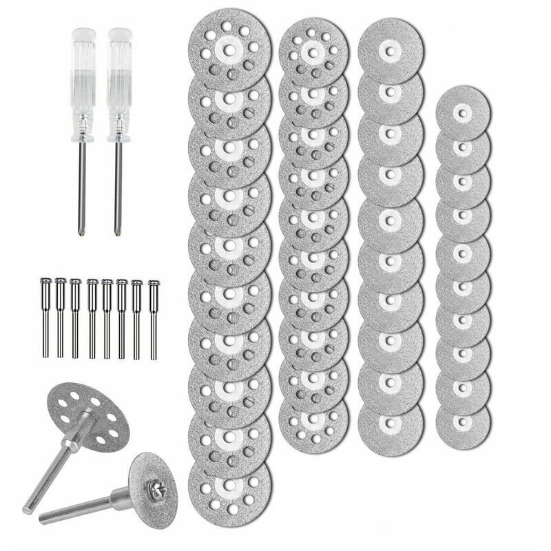 Il kit di dischi diamantati include 40 dischi diamantati, 8 mandrini e 2 cacciaviti. Con un'elevata efficienza di taglio, il kit è adatto per la maggior parte degli utensili rotanti e pietre tagliate volanti, vetro, ceramica e porcellana. Caratteristiche: Include 40 dischi da taglio diamantati (1 pollice / 0,87 pollici / 0,7 pollici / 0,6 pollici, ciascuno 10 pezzi), 8 cacciaviti da 0,12 pollici e 2 mandrini. I dischi da taglio sono realizzati con diamanti di alta qualità. Con alta efficienza di taglio, grande durata, qualità stabile, ecc. Il disco da taglio diamantato è rivestito in modo uniforme con particelle di diamante, affilato e robusto. Adatto per la maggior parte degli utensili rotanti e pneumatici. Perfetto per tagliare pietre preziose, vetro, ceramica e porcellana. Specifiche: Materiale: diamante taglio diamante Dimensioni ruote: diametro esterno: 25 mm / 1 pollice, 22 mm / 0,87 pollici, 18 mm / 0,7 pollici, 16 mm / 0,6 pollici Diametro interno: 3 mm / 0,12 pollici Peso